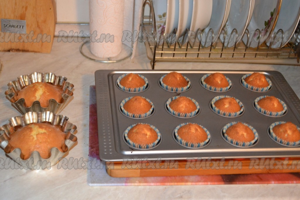 Готовые маффины достать из духовки, дать немного остыть, вынуть из форм и оставить до полного остывания. Я снимаю и бумажную капсулу, так как мои домашние любят, чтобы бочки немножко подсыхали. Маффины, замешанные на сливочном масле, получаются пышными, аппетитными, вкусными.