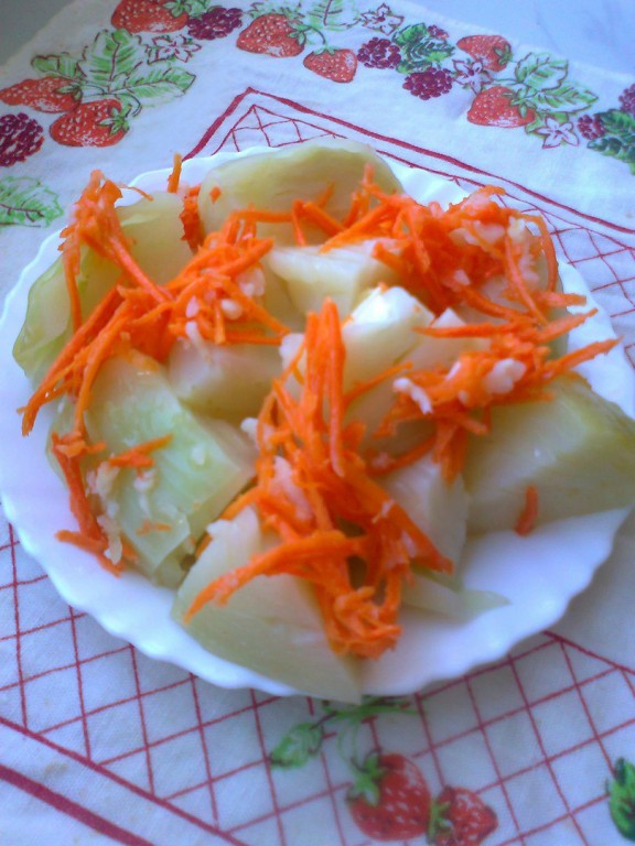 Ставим под гнёт (если жидкости достаточно, то не обязательно). Оставляем под гнётом в холоде на сутки. При подаче режем на мелкие кусочки, сверху выкладываем морковь с чесноком из маринада. Можно дополнительно полить ароматным растительным маслом, посыпать чесноком и петрушкой (но и без будет очень вкусно!). Приятного аппетита!