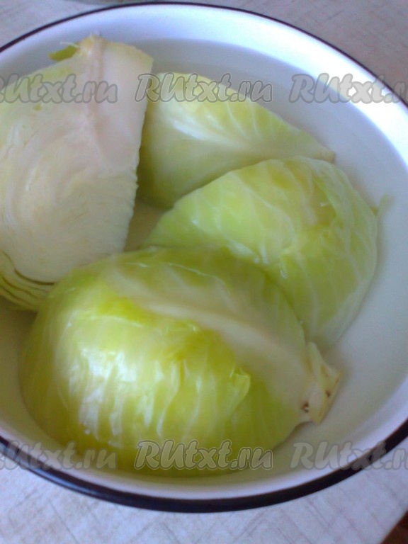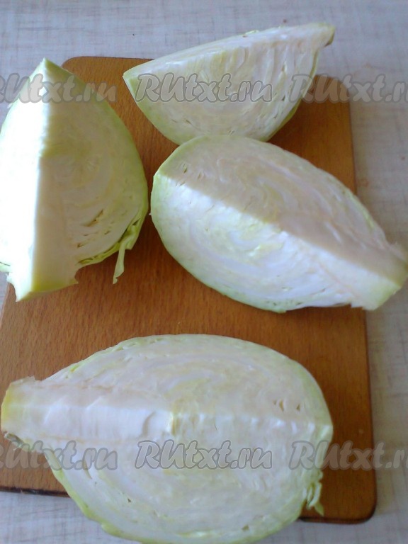 Капусту надо взять с плотной серединкой, очистить от верхних листьев и нарезать крупными кусками, то есть разрезать на 4 части.