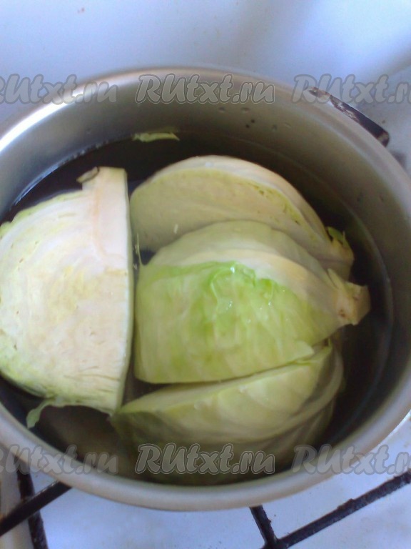 Сложить капусту в подходящую кастрюлю, залить водой. Варить до полуготовности, ориентировочно 10 минут.