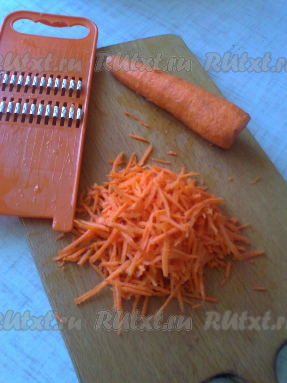 Морковь очистить и натереть на "корейской" или крупной тёрке. Чеснок очистить и пропустить через чесночницу.