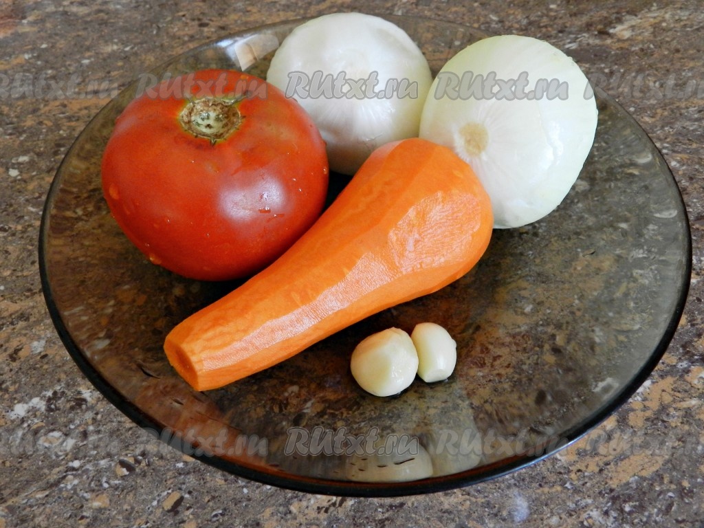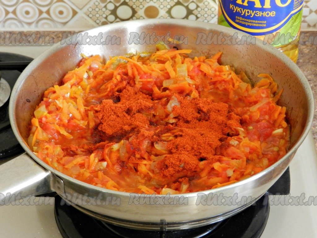 На растительном масле обжарить 1 нарезанную луковицу и натертую на терке морковь до золотистого цвета, иногда помешивая, затем посолить и поперчить. Добавить пропущенный через пресс чеснок, обжарить вместе 1 минуту. Затем добавить помидор без кожи, натертый на терке, и сладкую молотую паприку. Перемешать и потушить на медленном огне под крышкой 3-4 минуты. Снять приготовленную заправку с огня.