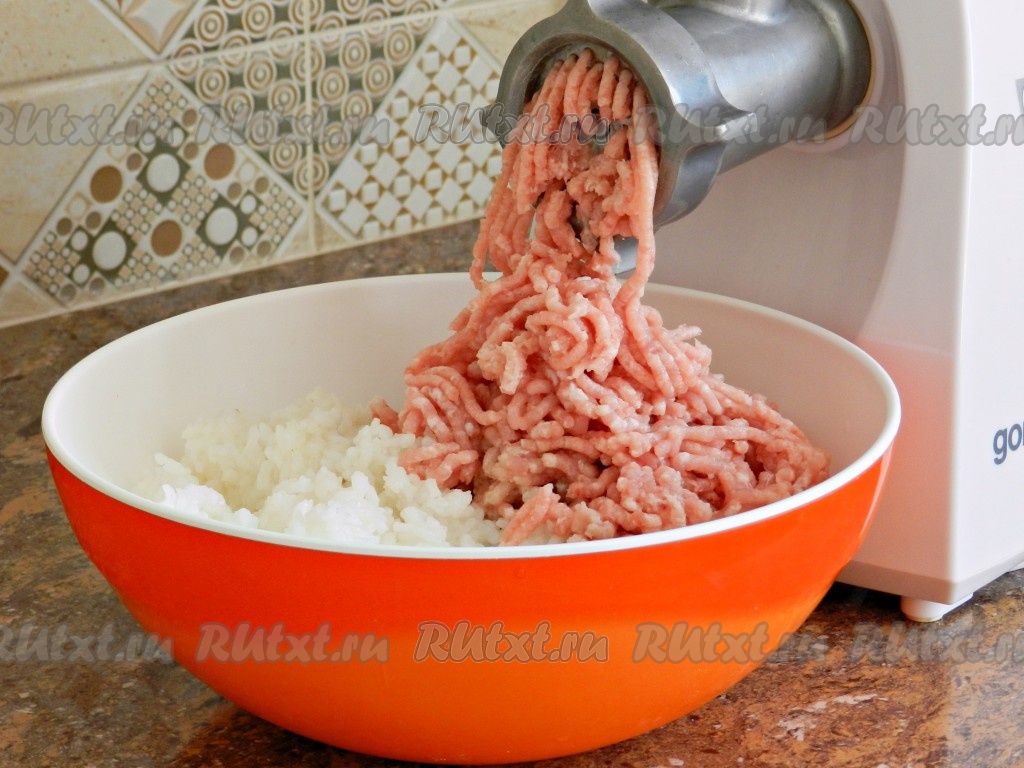 Смешать мясо с рисом, посолить и поперчить по вкусу. Фарш должен получиться мягким и вязким, не рассыпаться в руках.