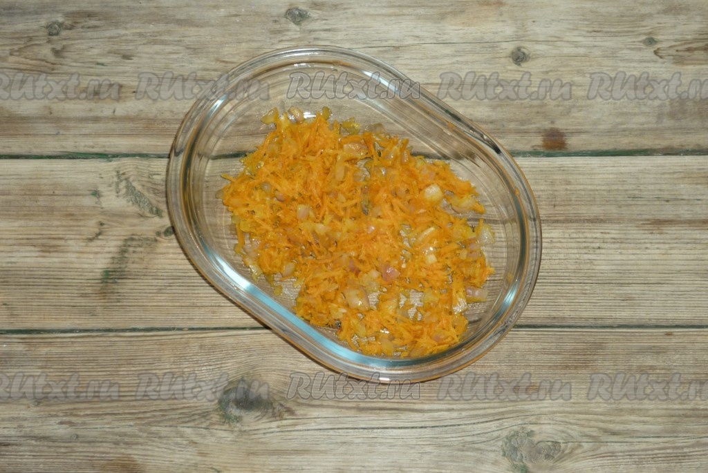 Лук и морковь очистить и вымыть под проточной водой. Лук нарезать кубиками, морковь натереть на тёрке. Обжарить овощи на растительном масле, помешивая, 5-7 минут. Добавить обжаренные овощи в суп.