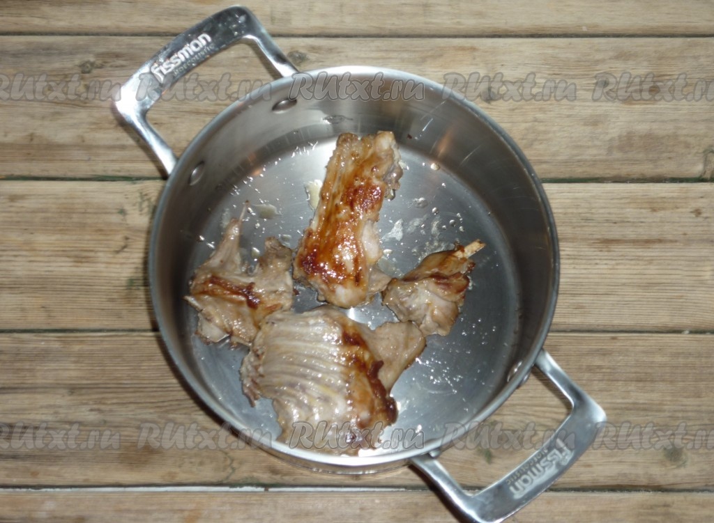Мясо кролика вымыть под холодной проточной водой, обсушить и обжарить до золотистой корочки на сковороде с растительным маслом. Обжаренное мясо сложить в кастрюлю, в которой будем готовить суп.