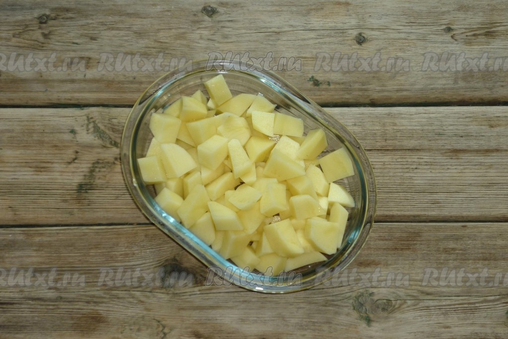 Картофель очистить и нарезать небольшими кубиками. Картофель добавить в суп с кроликом тогда, когда мясо будет мягким и практически готовым. Варить 10 минут. Добавить соль и чёрный молотый перец по вкусу.