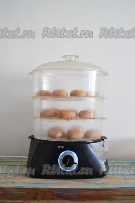 Выложить куриные котлеты в поддоны пароварки и включить на 30 минут.