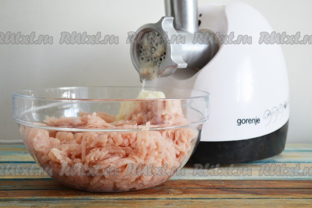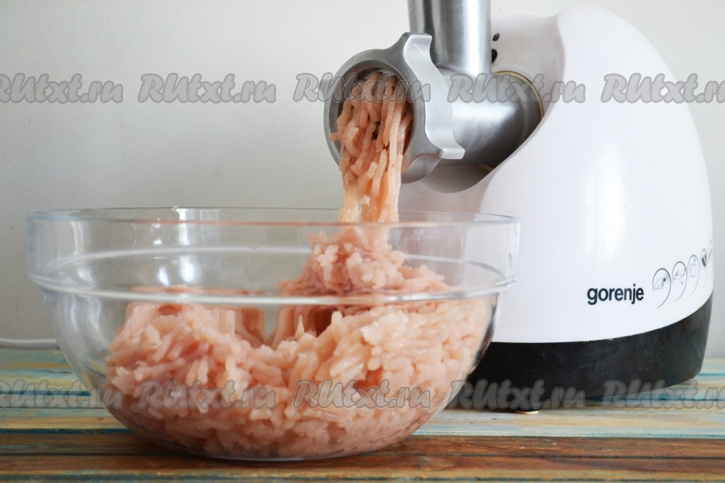 Куриное филе вымыть, нарезать на небольшие кусочки и пропустить через мясорубку (лучше использовать мелкую сеточку мясорубки).