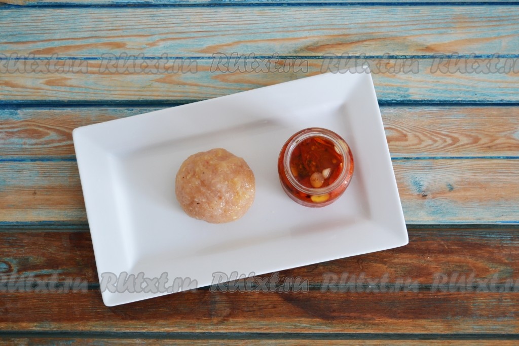 Влажными руками из небольшого количества фарша сформировать котлетку. Если Вы хотите сделать куриные котлеты с начинкой, то получившуюся котлету нужно приплюснуть, чтобы получилась лепешка, в центр которой выложить один кусочек вяленого помидора (или другую начинку).