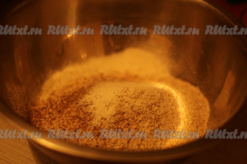 Смешать пшеничную муку, молотые овсяные хлопья, соль, кориандр в миске.