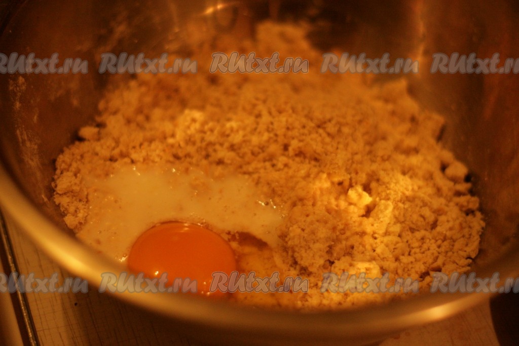 Добавить масло и втереть руками в крошку. Добавить молоко и яйцо, замесить эластичное песочное тесто для тарталеток.