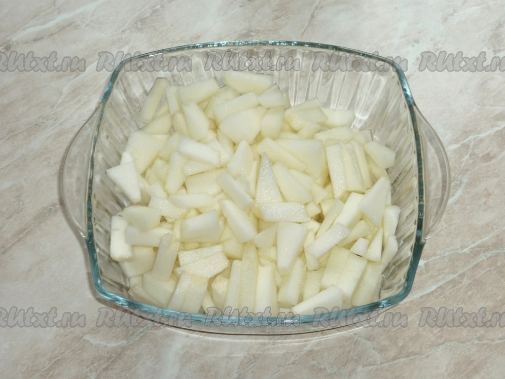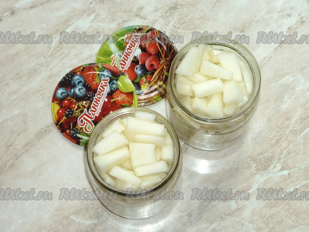 Количество воды нам понадобится столько, сколько влезет в банки, а это зависит насколько плотно они будут наполнены кусочками дыни.