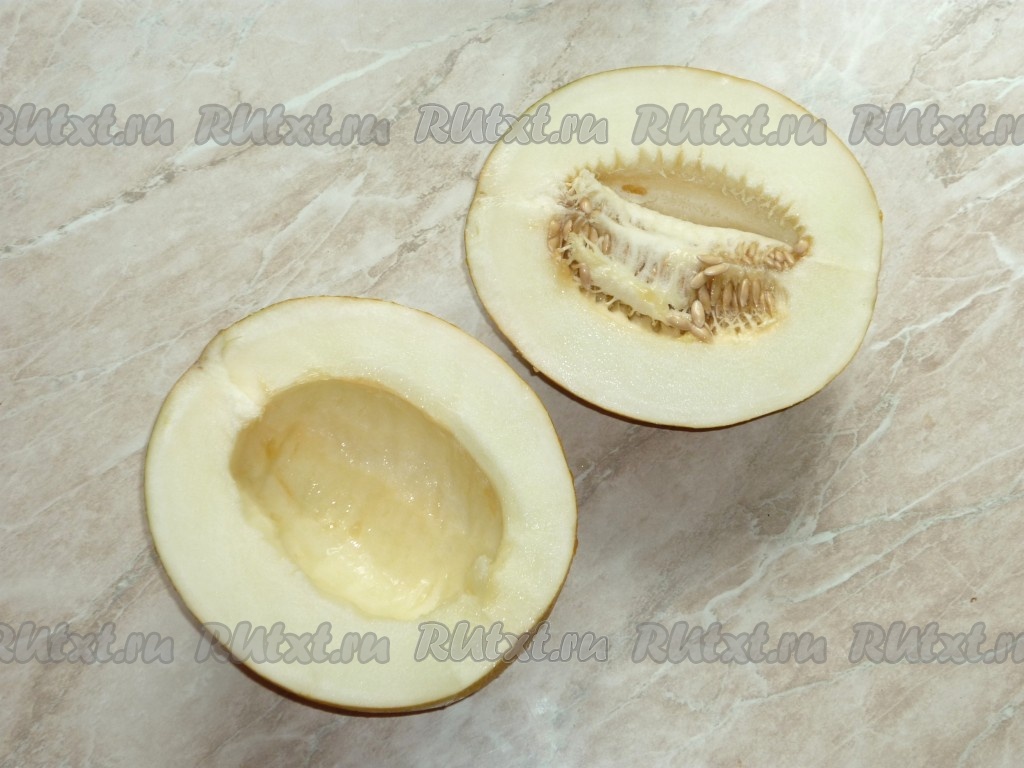 Дыню хорошо вымыть под холодной проточной водой. Обсушить, разрезать пополам и удалить с помощью ложки косточки.