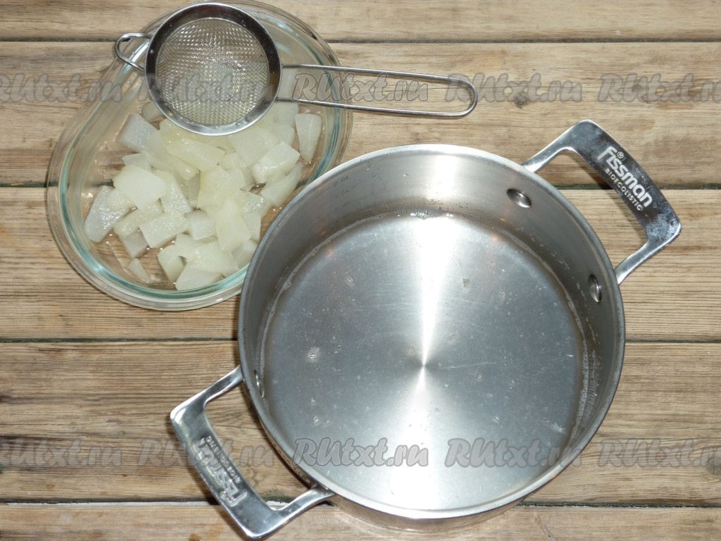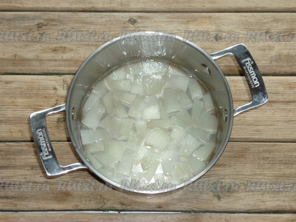 Дыню вымыть под холодной проточной водой, разрезать и удалить семена. Очистить дыню от кожицы. Очищенную мякоть дыни нарезать на небольшие кусочки, выложить в кастрюлю, залить 250 мл воды, всыпать сахар и лимонную кислоту (лимонную кислоту можно заменить на лимонный сок, который добавить в сироп по вкусу).