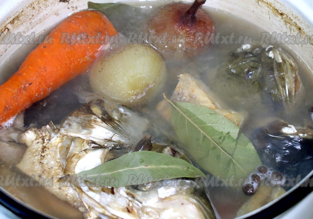 Голову толстолобика вымоем, удалим жабры (не пораньте руки, делайте это осторожно). Даем стечь воде или просушим бумажными полотенцами. Кастрюля потребуется в 1,5-2 раза больше объема воды. Сложим головы, зальем холодной водой. Ждем, когда закипит, и сразу снимаем появляющуюся пену. Закладываем целиком лук в тонком слое шелухи, зонтик укропа и очищенную целую морковь, можно добавить крупно нарезанный сельдерей, который, как губка, впитывает "осадок" и тем самым осветляет бульон. Уменьшим огонь до минимума и будем варить при самом слабом кипении (без бурления) с открытой крышкой около 4 часов. За час-полчаса до конца варки пробуем на вкус. Солим из расчета 1 чайная ложка соли на литр воды. Добавляем лавровый лист, перец горошком и довариваем еще около 1 часа. Выключаем бульон. Выкладываем рыбьи головы в дуршлаг, по возможности сохраняя их форму (так буде легче отобрать мясо от кости), остужаем.