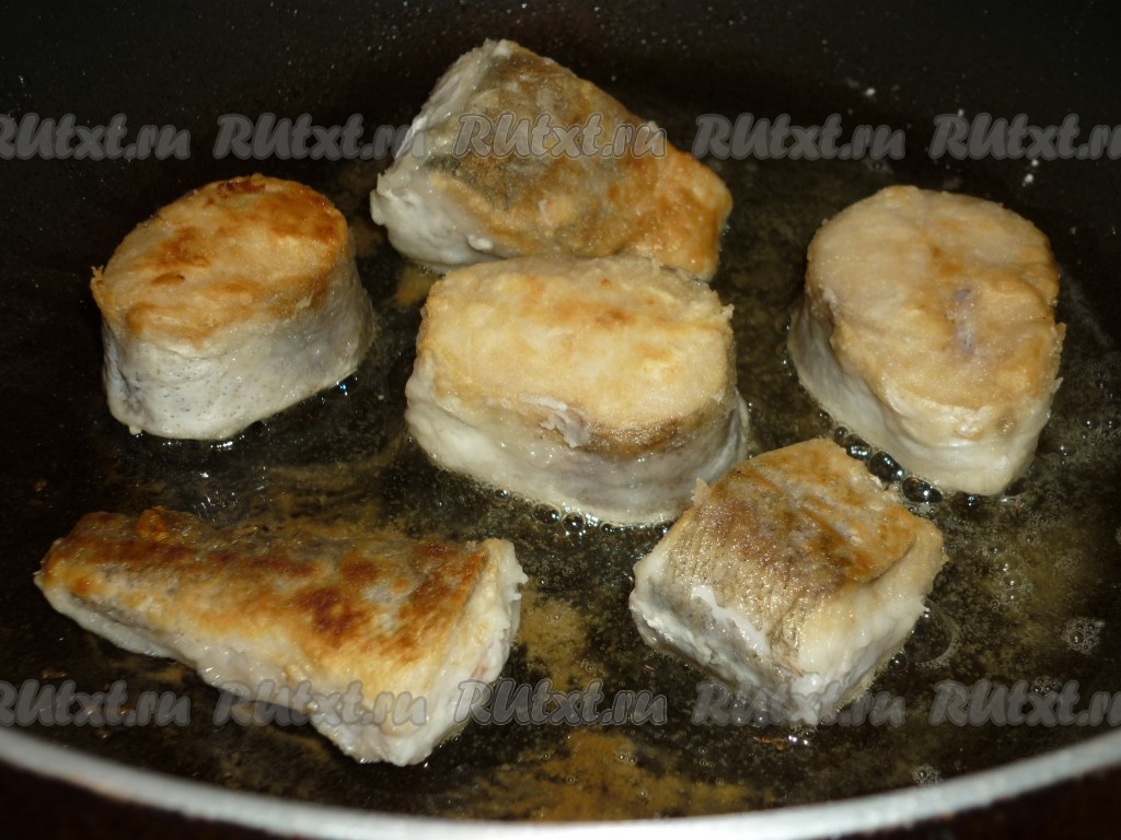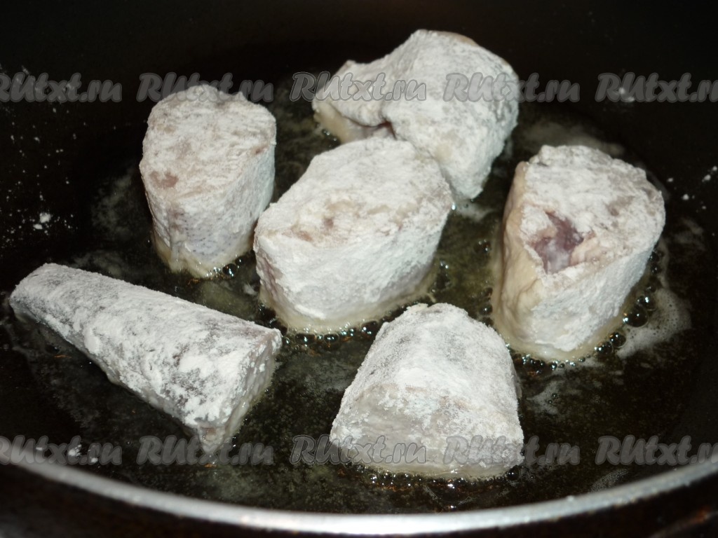 Посолить кусочки рыбы и оставить на 5-10 минут. Затем кусочки рыбки обвалять со всех сторон в муке и выложить в сковороду, заранее разогревшуюся с растительным маслом.