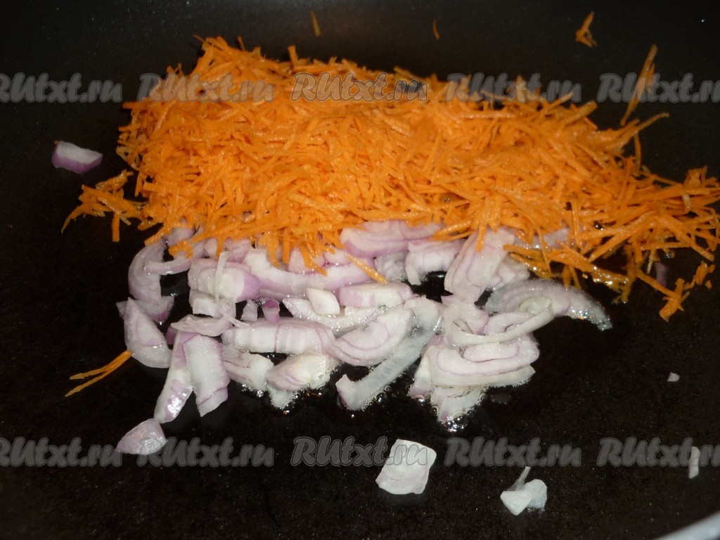 Лук и морковь очистить, вымыть. Лук нарезать кубиками, морковь натереть на крупной тёрке. Переложить морковку с луком в сковороду, в которой обжаривалась рыба, перемешать. Обжарить овощи в течение 5 минут, периодически помешивая, на среднем огне.