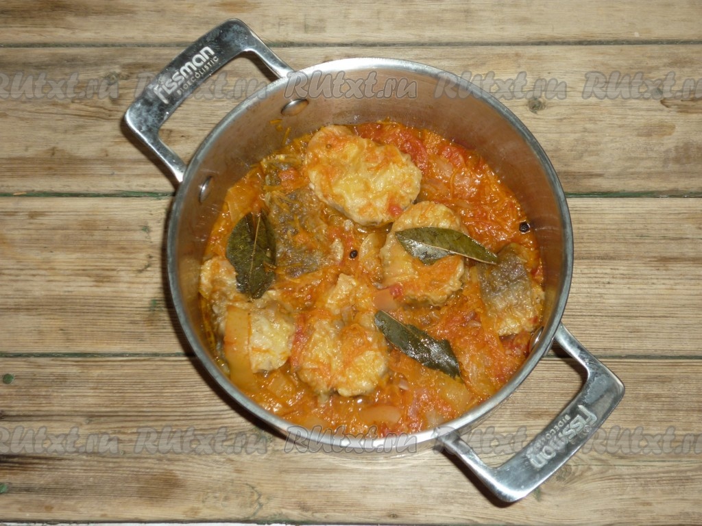 Выложить обжаренные овощи в кастрюлю на кусочки рыбы. Добавить лавровые листья и чёрный перец горошком.