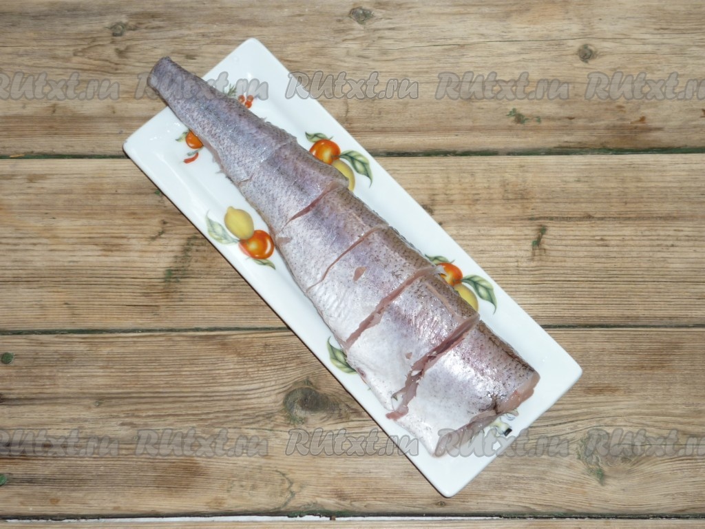 Если рыба заморожена, её нужно разморозить. Отрезать плавники, удалить голову, если она есть, внутренности и чёрную плёночку из брюшка рыбы. Нарезать рыбку на порционные кусочки.