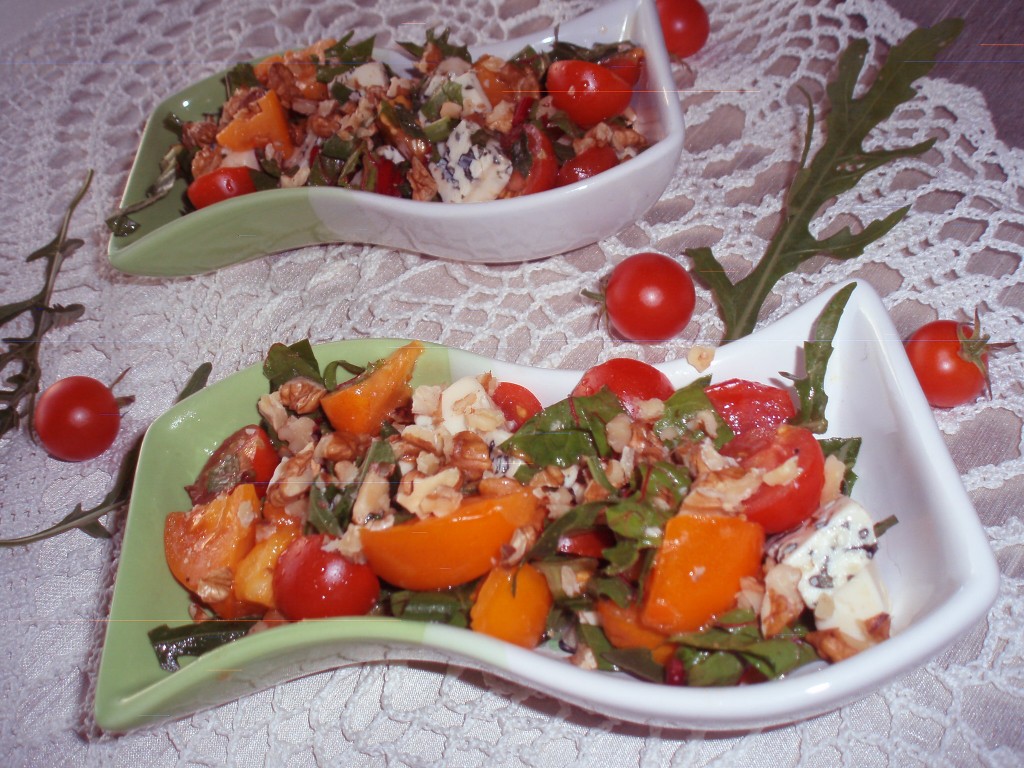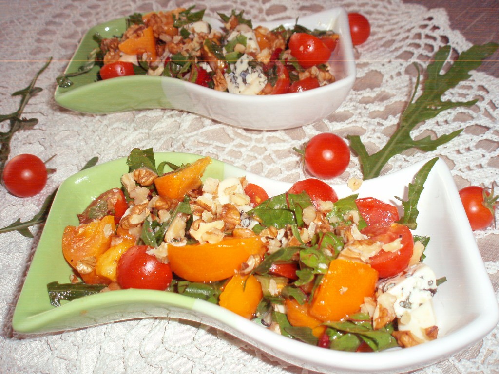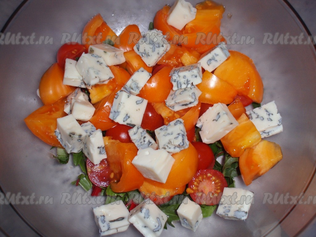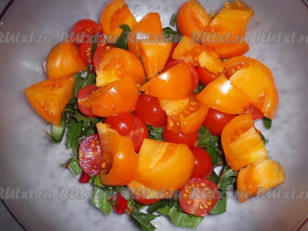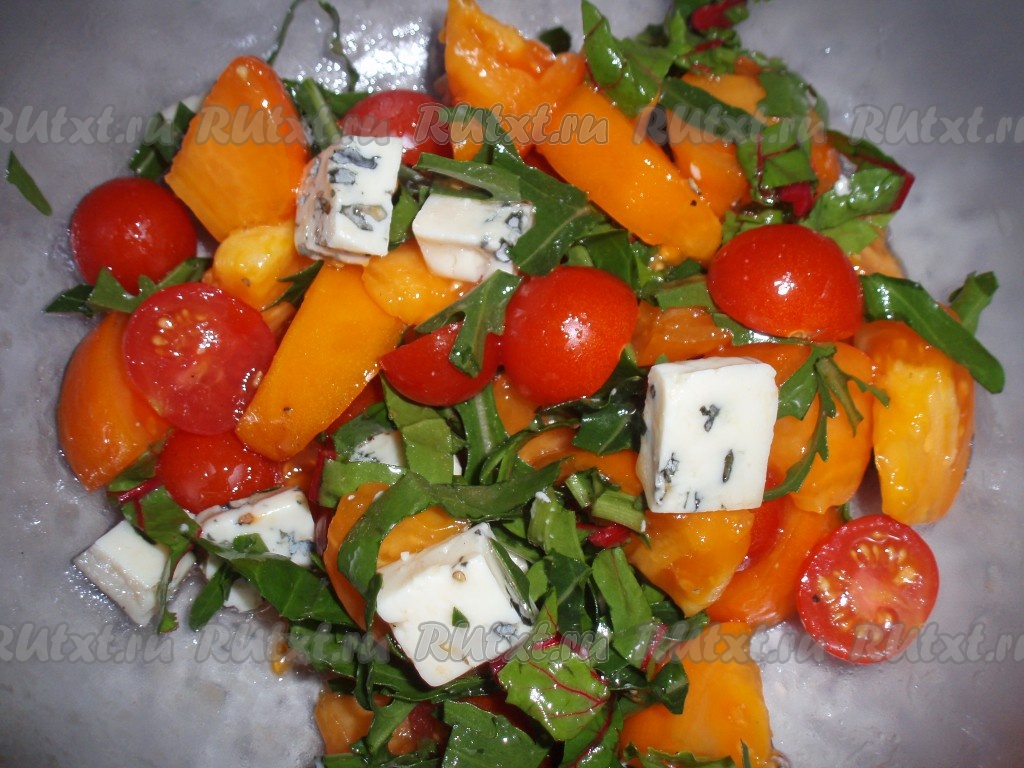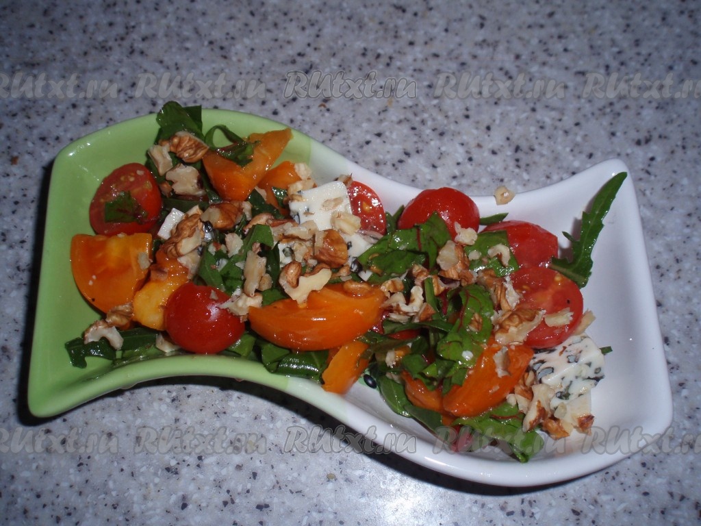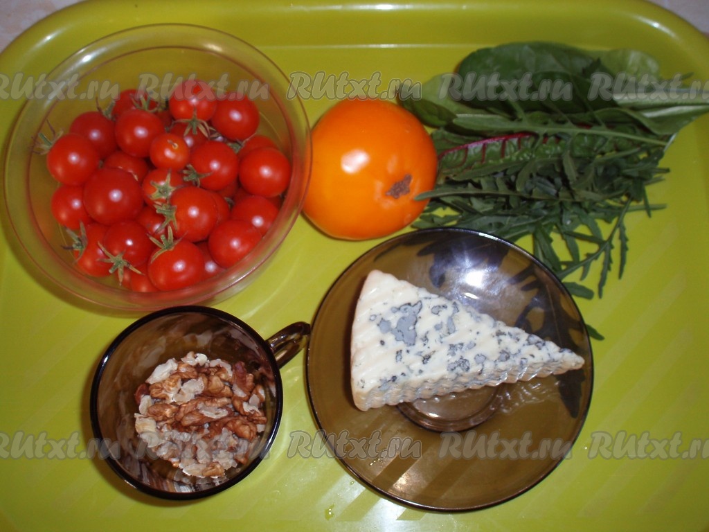 Свежий, сочный салат с помидорами, сыром и орехами прекрасно подойдет в качестве перекуса или гарнира к мясным и рыбным блюдам. Листья салата можно использовать любые, я добавила рукколу. Блюдо будет особенно ярким и нарядным, если взять помидоры разных цветов.