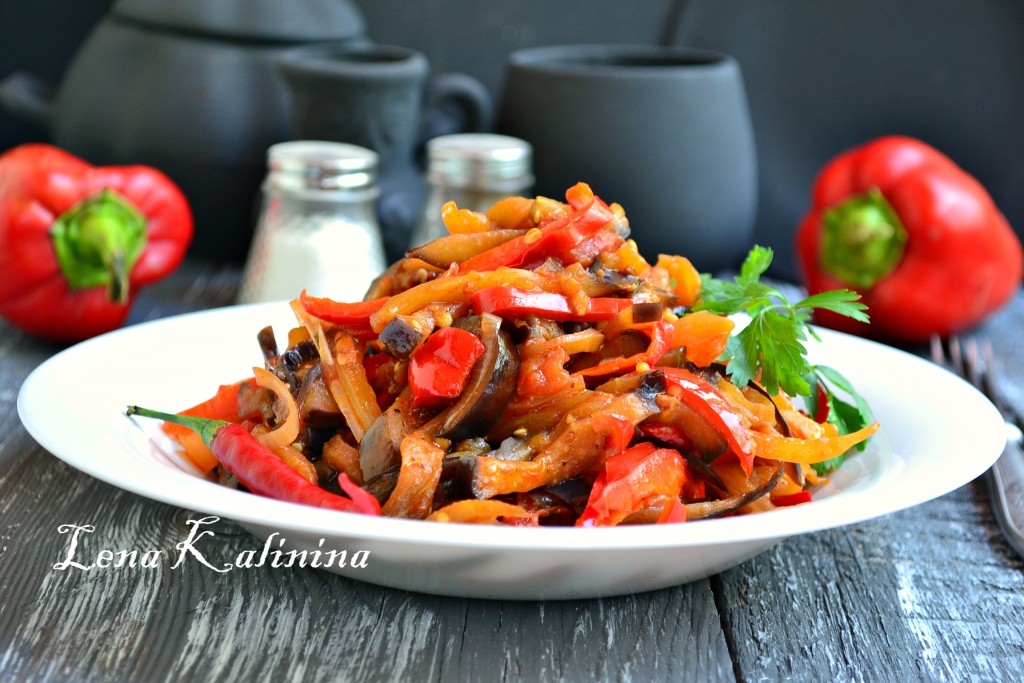 В горячем виде баклажаны, жареные с болгарским перцем и помидорами, можно подать в качестве гарнира к мясу, птице. После остывания это блюдо можно подать в качестве закуски, украсив зеленью!