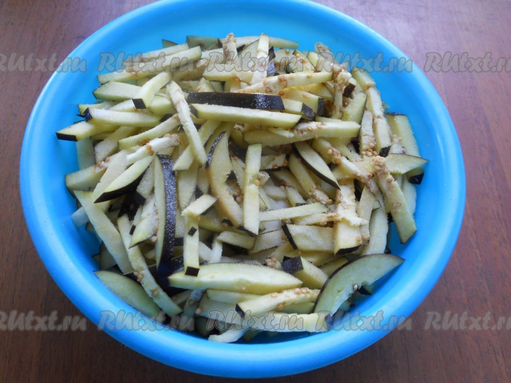 Баклажаны вымыть, отрезать кончики с двух сторон. Баклажаны нарезать на тонкие брусочки, посолить, перемешать и оставить на 30 минут.