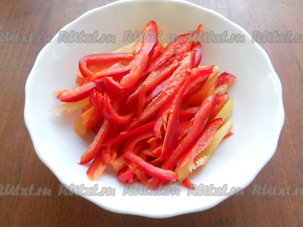 Болгарский перец лучше взять разных цветов, тогда блюдо получится более ярким. Очистить болгарские перцы от семян и плодоножек, нарезать длинной соломкой.