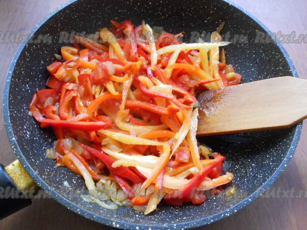 Далее добавить в сковороду нарезанные болгарские перцы, перемешать, обжаривать на небольшом огне, время от времени перемешивая, 4-5 минут.