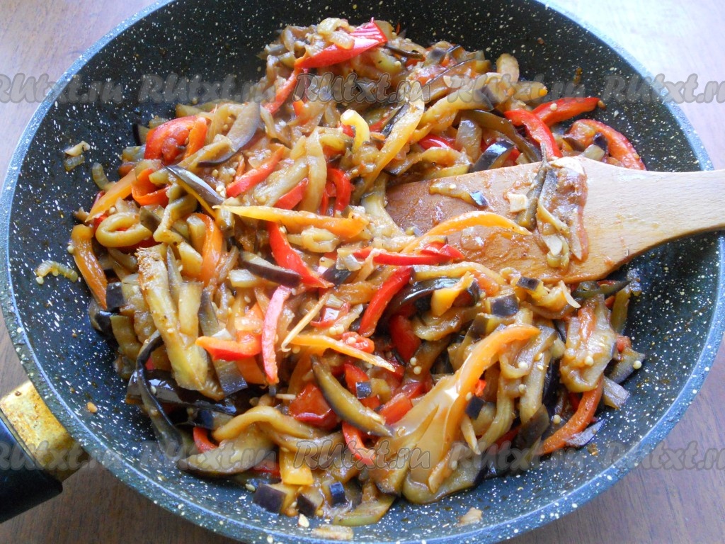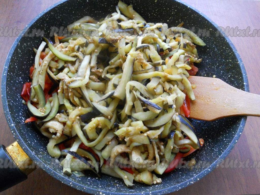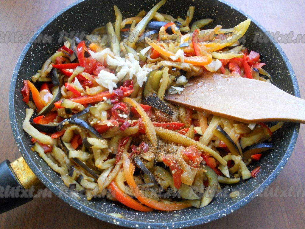 Баклажаны хорошенько отжать от жидкости и добавить в сковороду с обжаренными овощами.