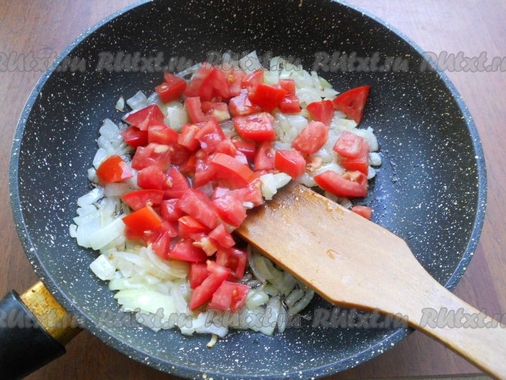 В сковороде прогреть растительное масло, выложить очищенный и мелко нарезанный лук, обжарить его на среднем огне до прозрачности (в течение 3-4 минут), иногда помешивая. Помидоры, по желанию, очистить от кожуры, нарезать на небольшие кубики. После того как лук обжарится до прозрачности, добавить к нему нарезанные помидоры, перемешать. Обжарить овощи в течение 2-3 минут (помидоры должны стать достаточно мягкими), периодически перемешивая.