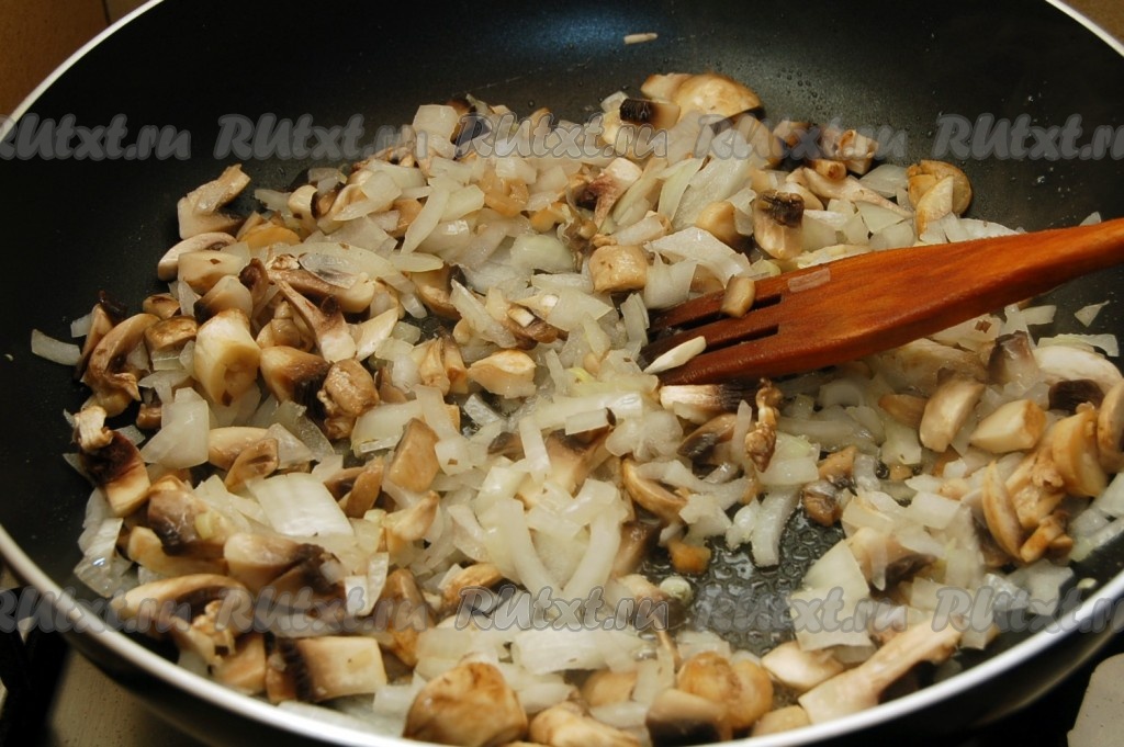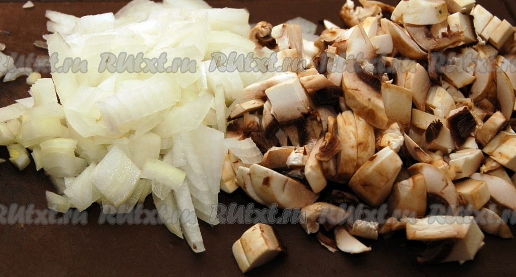 Сначала приготовим начинку. Нарежем мелко грибы и лук.