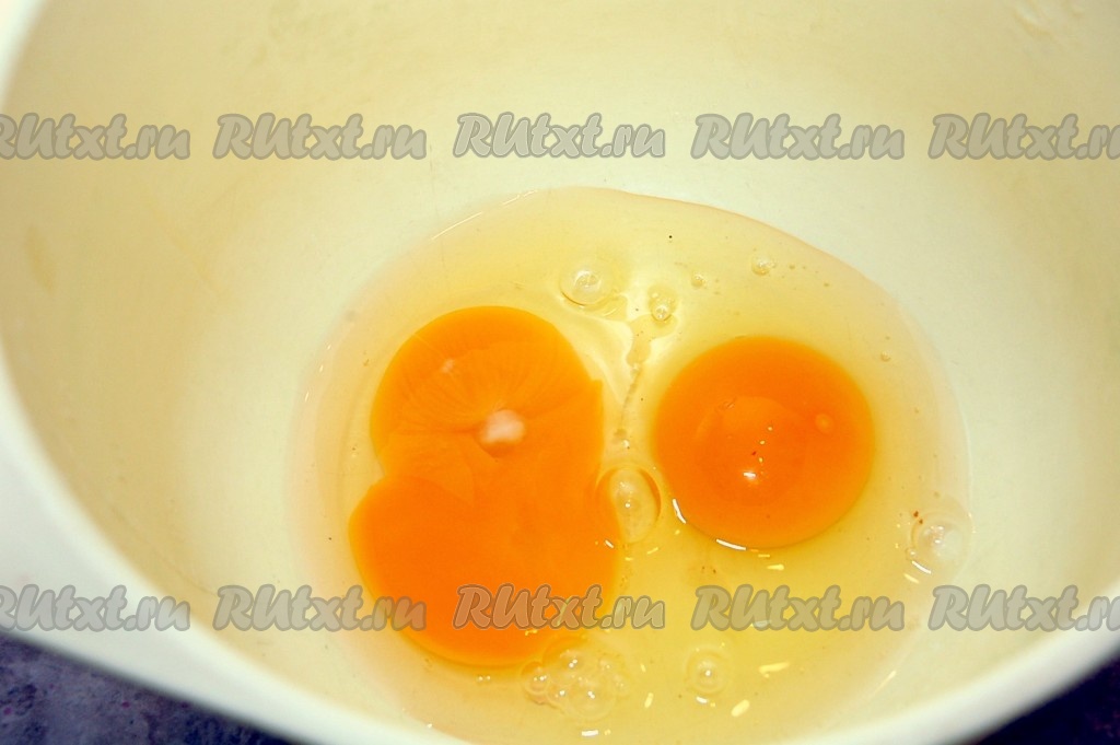 Теперь испечем блинчики. Для этого разобьем в миску яйца.