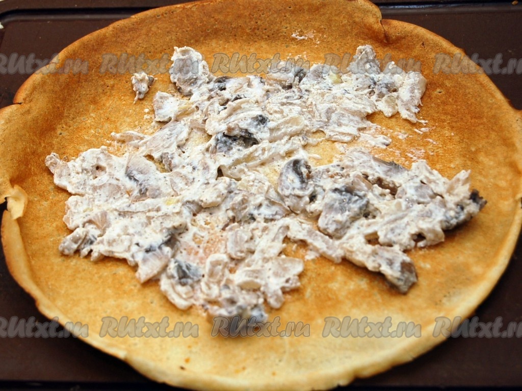 Остывшую начинку из грибов раскладываем на более обжаренную сторону блина.