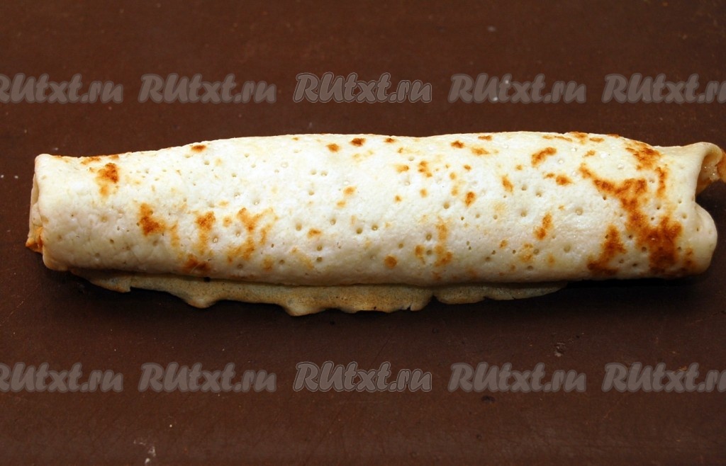 Сворачиваем блин с начинкой рулетиком.