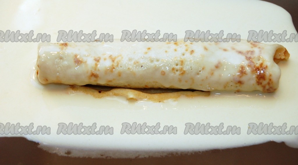 Готовый рулетик окунаем в остатки блинного теста (из которого мы пекли блины).