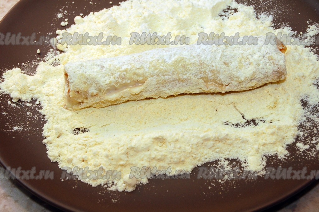 Теперь блинный рулетик обваливаем в кукурузной муке.