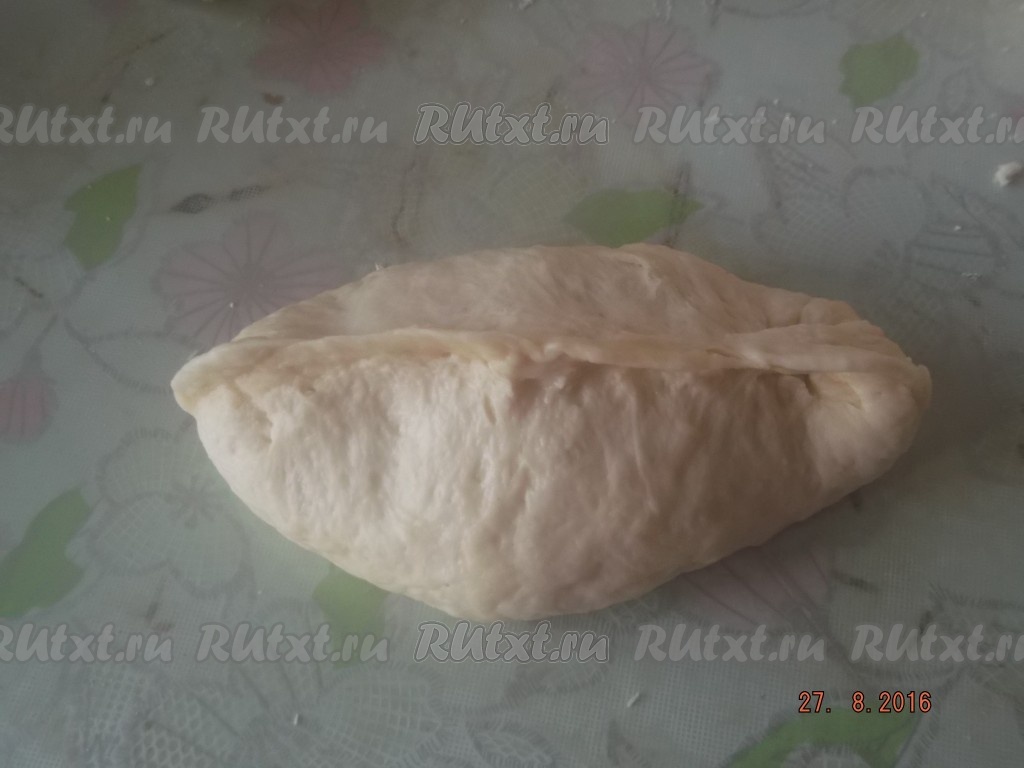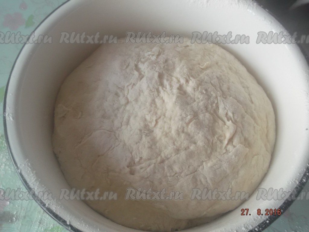 Затем выливаем наши забродившие дрожжи в получившуюся смесь воды и жира, перемешиваем, постепенно всыпаем муку и замешиваем не тугое тесто, но чтобы к рукам не прилипало. Оставляем наше тесто в теплом месте, накрыв его полотенцем, пока не поднимется вдвое (это займёт примерно 30 минут).