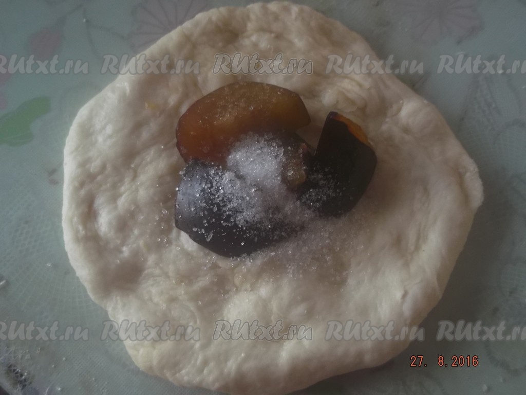 Затем, когда наше тесто подойдет, приступаем к лепке пирожков. Делим тесто на небольшие кусочки. Каждый кусочек теста разминаем в лепешку, в середину выкладываем несколько долек слив и посыпаем сахаром.