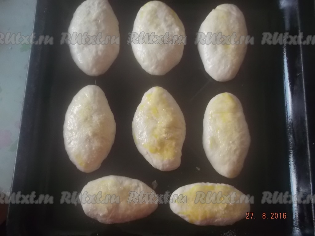 Складываем пирожки со сливами на смазанный маслом противень вниз швом. Смазываем сырым яйцом и посыпаем сахаром.
