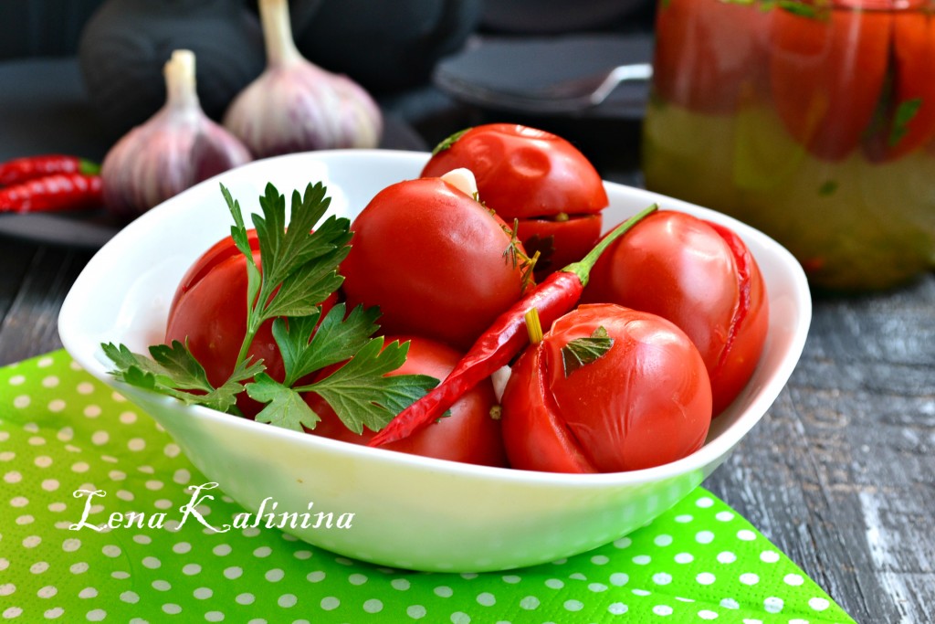 Прикрыть банку крышкой (не плотно) и оставить помидоры при комнатной температуре на сутки. Очень вкусные малосольные помидоры, фаршированные зеленью и чесноком, готовы! Перед употреблением поместить помидорчики в холодильник. Хранить закуску также следует в холодильнике.
