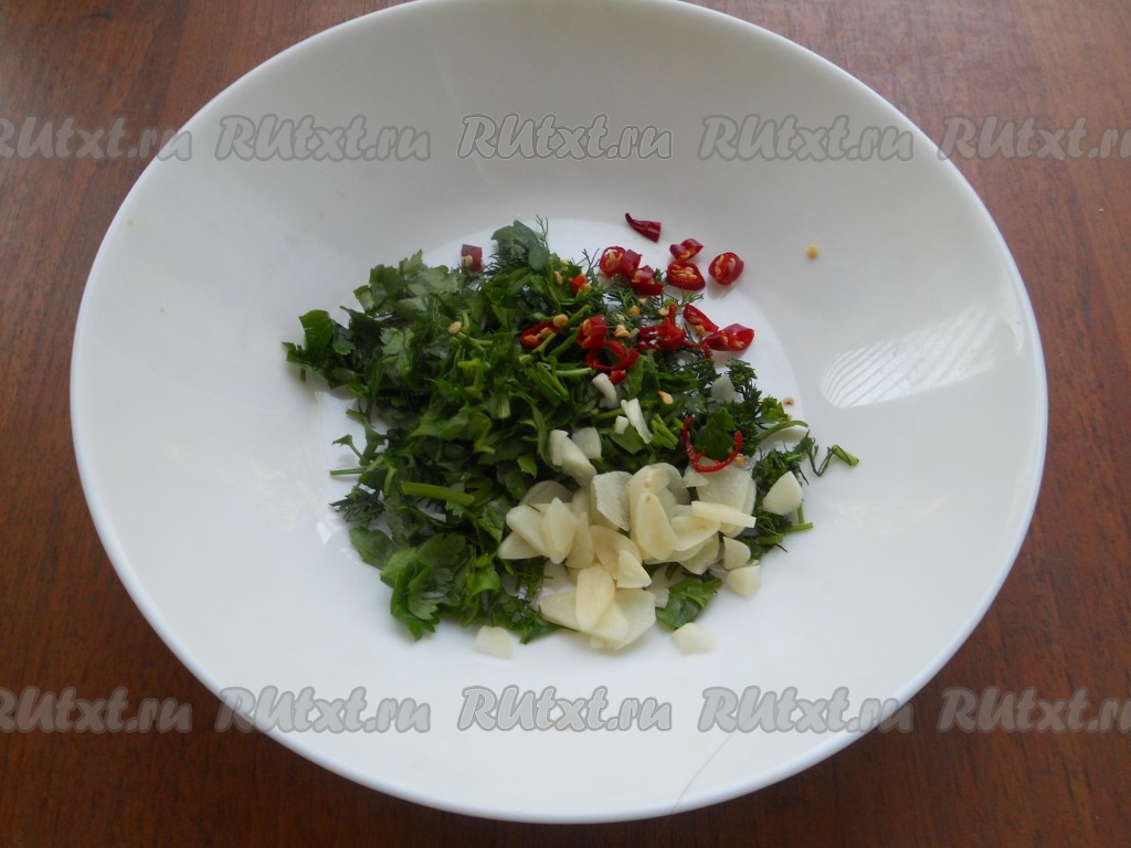 Зелень измельчить, добавить нарезанный тонкими пластинами чеснок и мелко нарезанный перец чили. Перемешать.