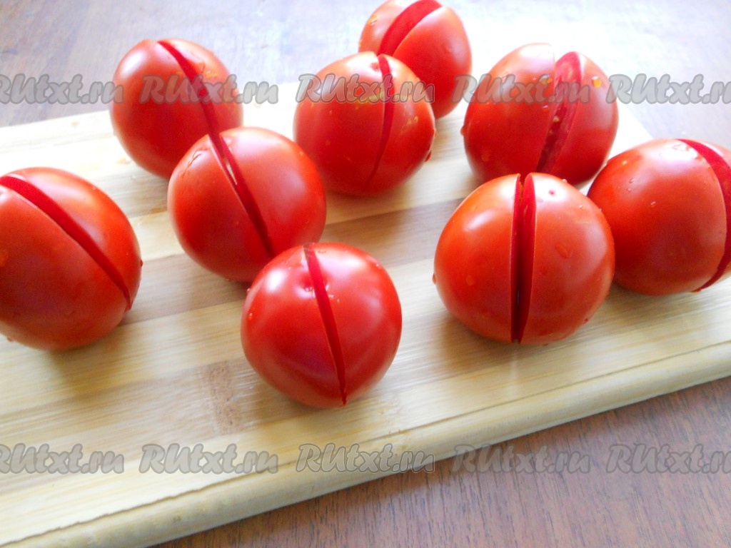 Помидоры вымыть, разрезать пополам, но не до конца.