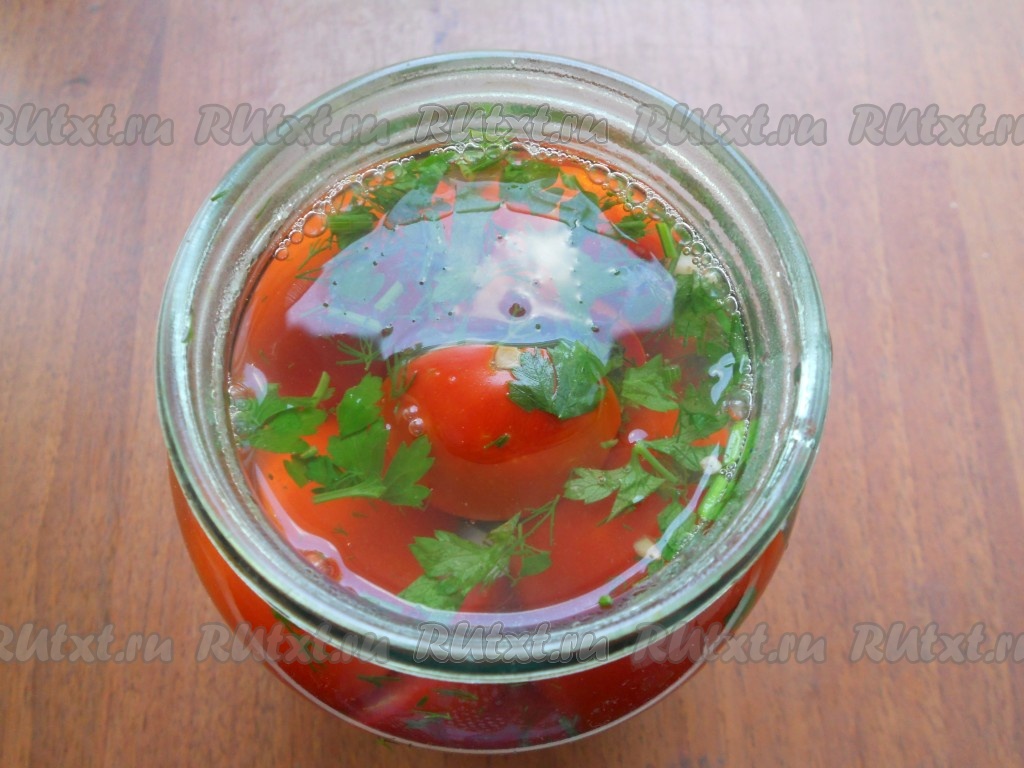 Зеленью с чесноком и перцем начинить помидоры (понемногу вложить в разрезы). Помидоры плотно уложить в стеклянную банку до плечиков.