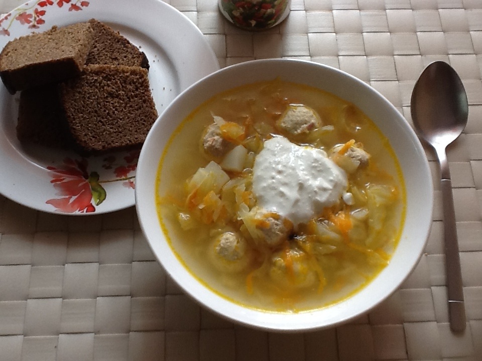 Вкусные и легкие щи с фрикадельками готовы! Подаем со сметанкой!