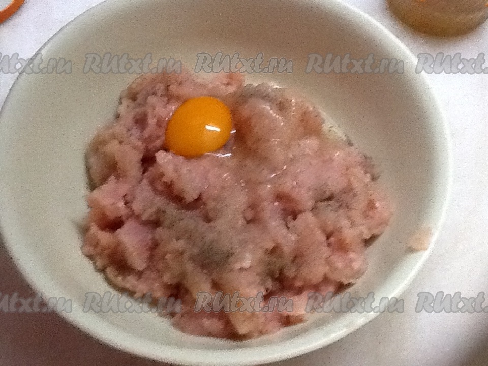 Тем временем готовим фарш для фрикаделек: в куриный фарш добавляем яйцо, солим, перчим, можно добавить зубчик чесночка (я добавила ложку своей домашней аджики) и хорошо перемешиваем.