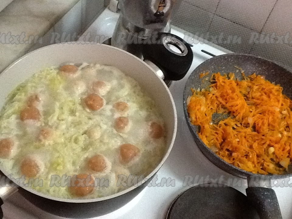 Когда картошка сварится, скатываем из получившегося фарша шарики, периодически смачивая руки, и опускаем их в кипящие щи. Морковка с луком, пока томятся рядом!