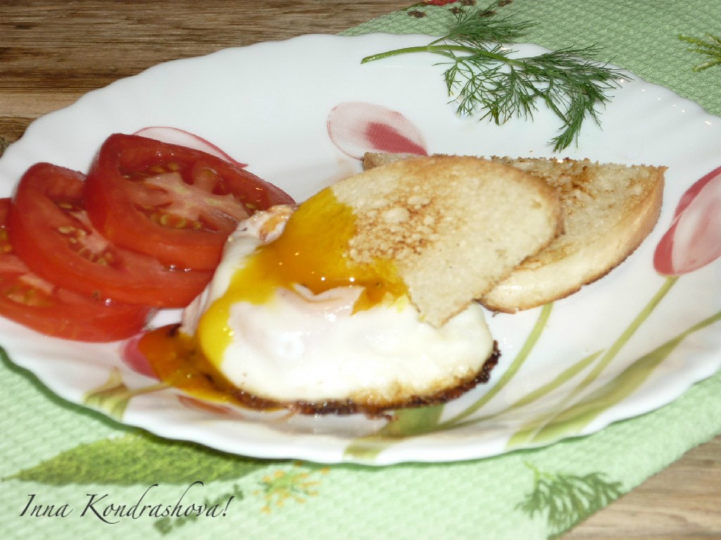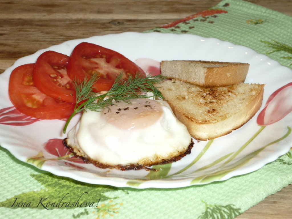 Яичница в болгарском перце готова, аккуратно переложить со сковороды на тарелку и подать к столу со свежими овощами и хрустящими гренками в горячем виде. По желанию, можно украсить укропом.