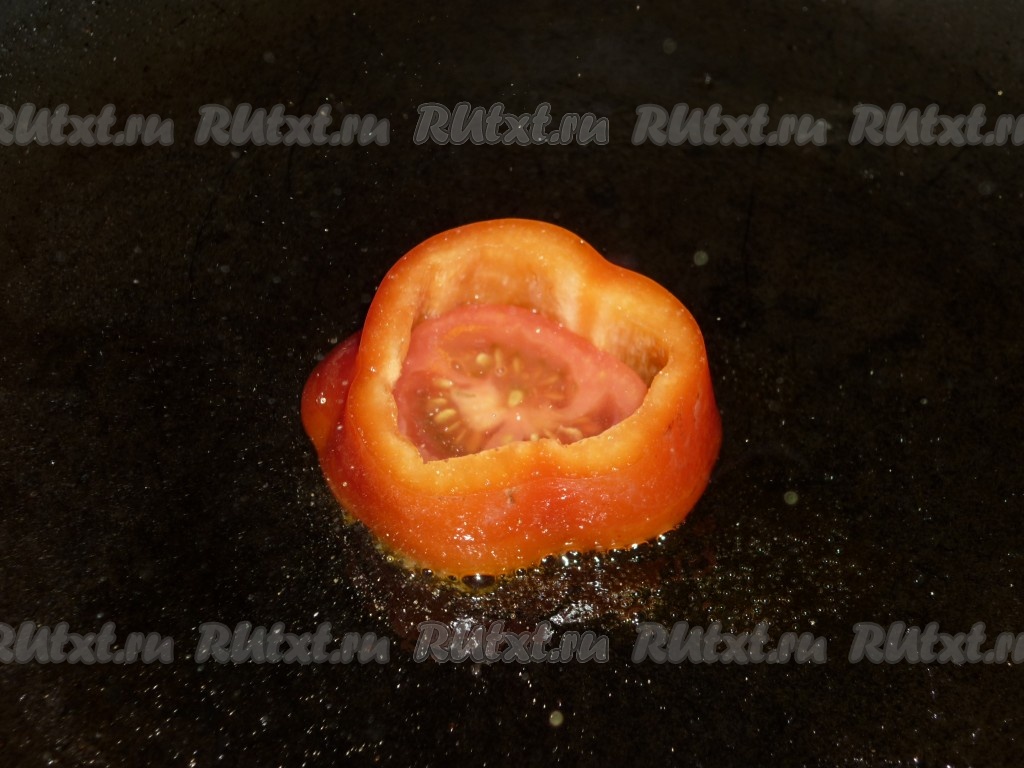 Перец вымыть, обсушить и нарезать кольцами толщиной 1,5-2 см (для приготовления яичницы из 1 яйца понадобится 1 кольцо болгарского перца), очистить от семян и перегородок. Помидор вымыть и нарезать кружочками. Разогреть сковороду с растительным маслом, выложить кольцо перца, поместить в него кружочек помидора (если нет помидора, можно обойтись и без него).