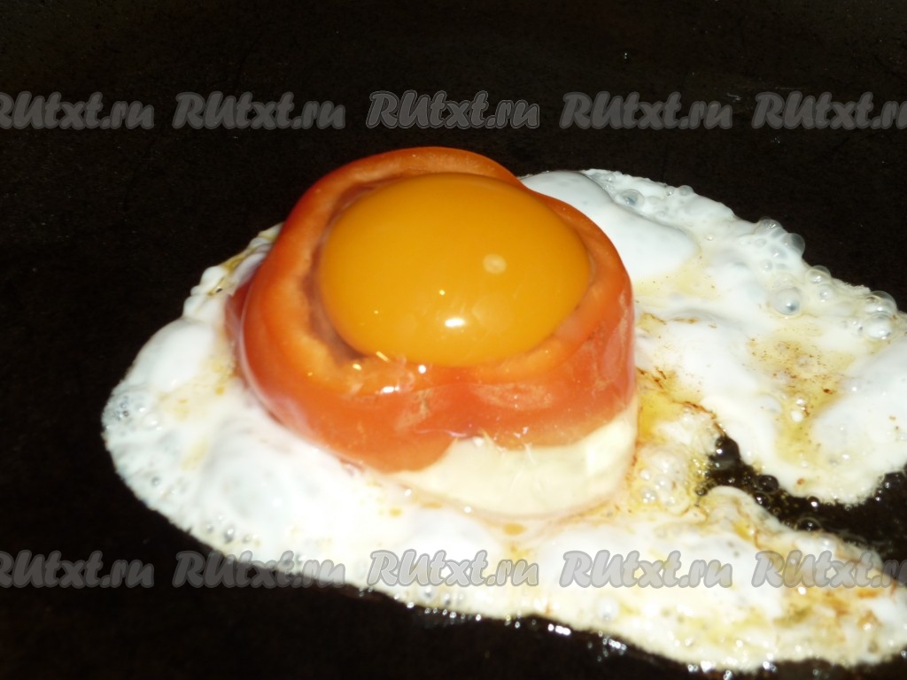Вбить яйцо в кружочек болгарского перца. Я готовила одну порцию завтрака, поэтому жарила одну яичницу в перце. Но на сковороде можно сделать одновременно и несколько порций, вбивая по яйцу в каждый кружочек перца. Помидора и перца хватит на несколько порций. Посолить и поперчить по вкусу, огонь уменьшить до среднего и готовить блюдо под закрытой крышкой.