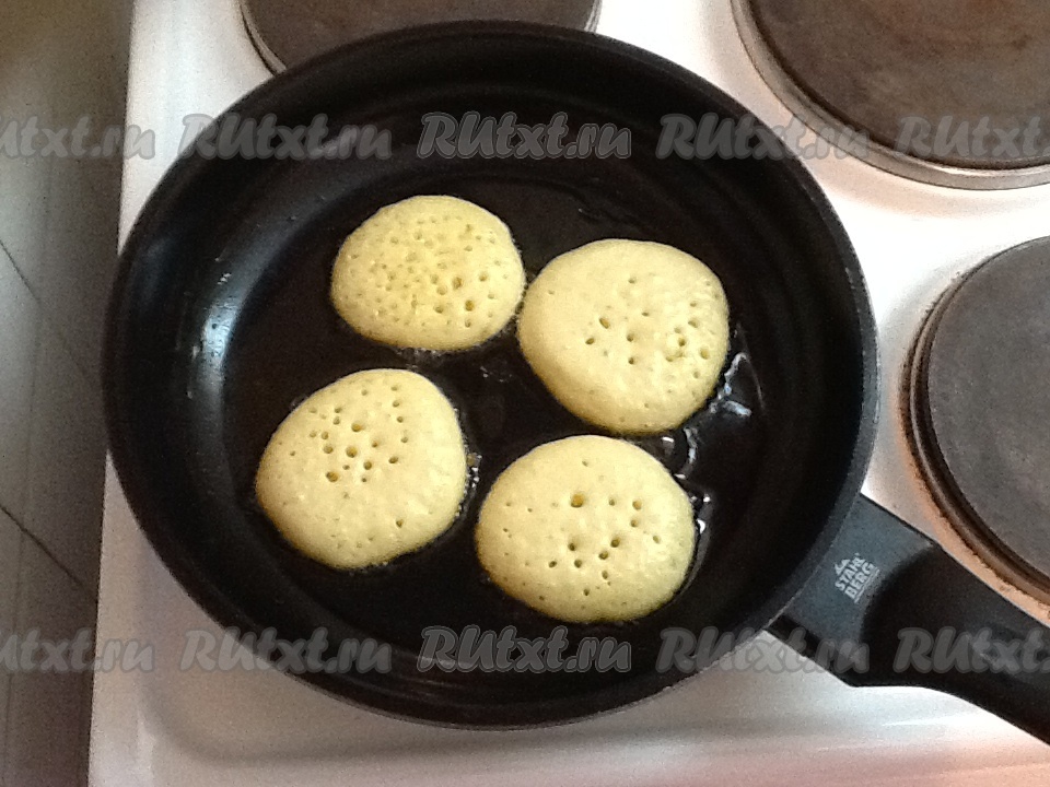 Ставим сковороду на плиту, добавляем подсолнечное масло и разогреваем. Тесто берем ложкой аккуратно, не перемешивая, и выкладываем на горячую сковороду.